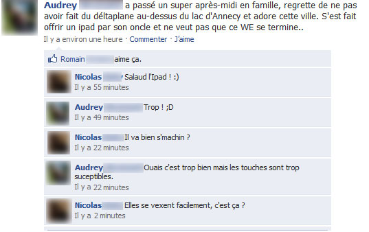 En même temps, le principe de Facebook, c’est de raconter sa vie. Donc si vous en avez marre de voir des anecdotes inutiles et inintéressantes qui sont plutôt marrantes, grand bien vous fasse.